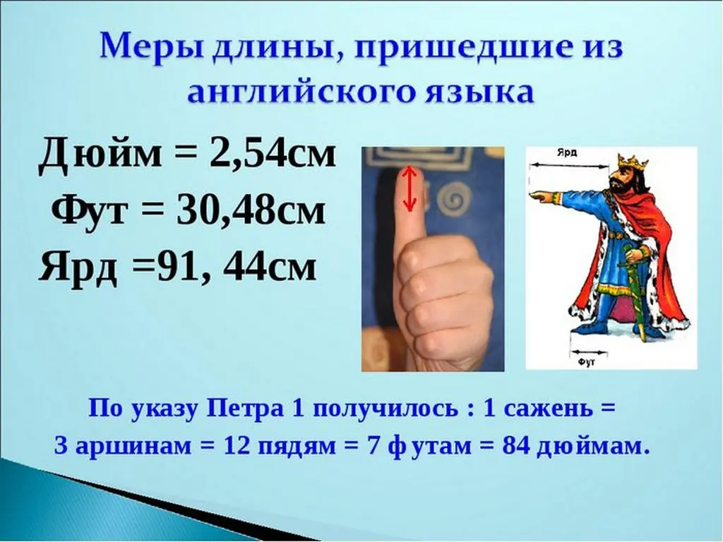 Так ещё в древности меры длины основывались на размерах отдельных частей тела человека: пальца, ладони, ступни. Интересно, что даже в нашем веке современные единицы измерения соотносятся с измерениями частей тела.