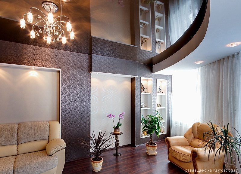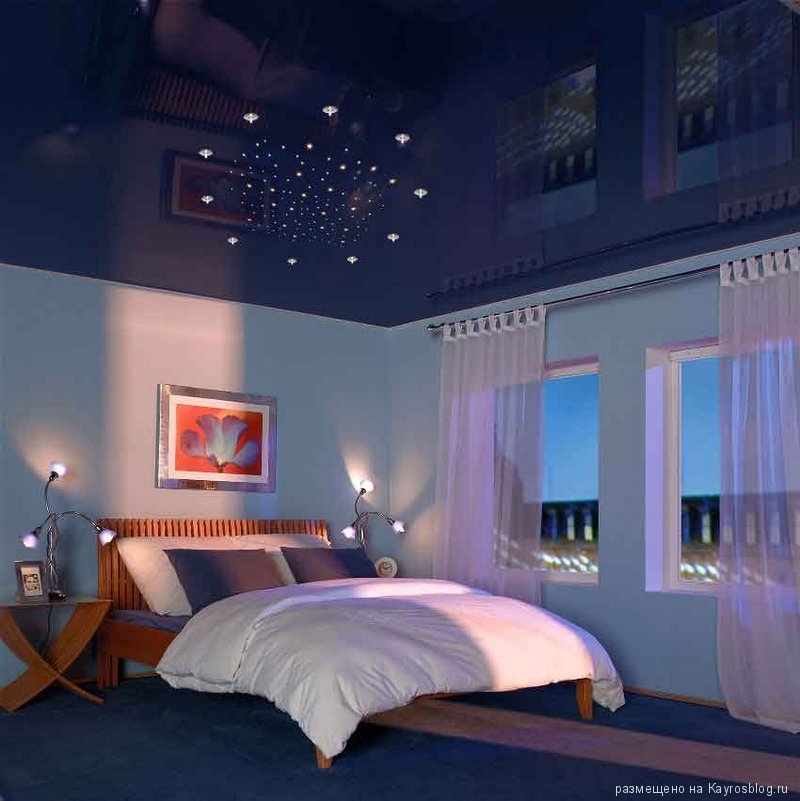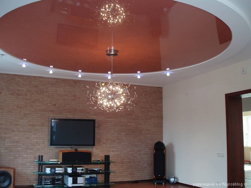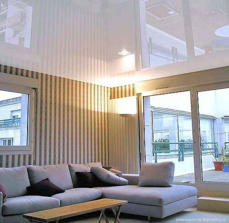 Если в Вашем доме круглый год тепло (по крайней мере, температура не опускается ниже – 5 ˚С), то для отделки потолков вполне может быть достаточно применения виниловой пленки. Материал красить не нужно. Любая крупная фирма предложит на выбор не менее двухсот расцветок. Более того, в отличие от тканевого полотна, которое имеет всегда матовую фактуру, пленка ПВХ бывает еще и сатиновая, и «металлик», и глянцевая, замшевая, полупрозрачная, узорчатая.