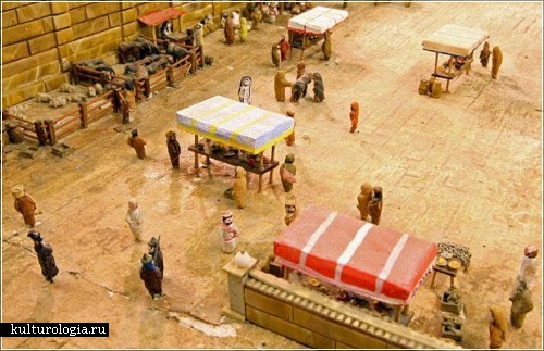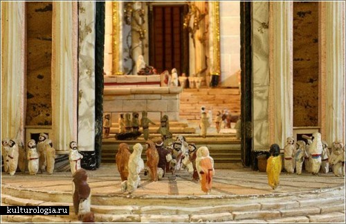 Все сделано вручную. Пенсионер вырезал фанерные доски для создания стен храма, изготовил вручную и покрасил каждый глиняный кирпичик и плитку, а также изваял 4000 крошечных человеческих фигурок, чтобы зеселить внутренний двор. Костюмы тоже были сшиты самим автором. На изготовление каждой фигурки уходит примерно 3 часа.