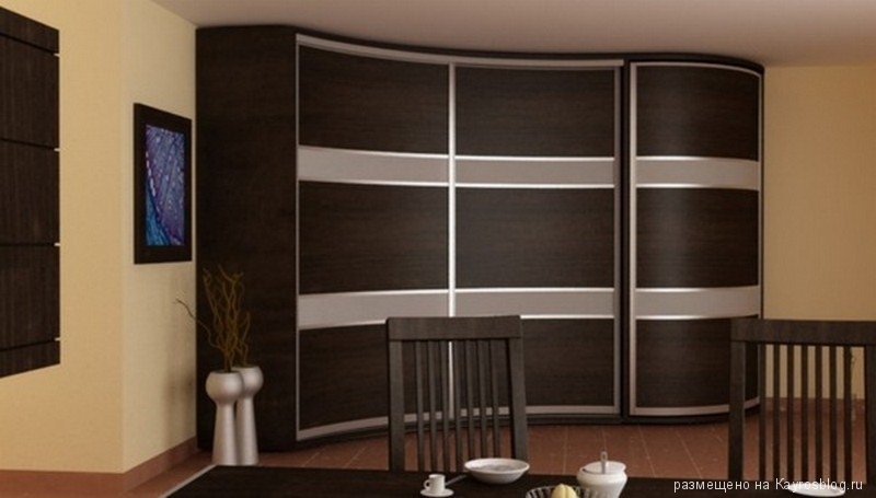 Любой шкаф визуально занимает пространство, а радиусный угловой шкаф купе встроенный до потолка кажется еще больше. Дизайнеры смягчают громоздкий внешний вид светлым ламинированием, стараются не использовать зеркала и делать угол не слишком широким. Внутри шкафа встраивают вешалки в два яруса, добавляют пару ящиков для белья, ремней, галстуков, шарфиков и перчаток, крепят полки для постельных принадлежностей, а внизу пару полок для обуви. Внутренне пространство шкафа только выиграет, если все будет мобильным и удобным. Лишние полки и перегородки со временем станут только мешать, именно поэтому следует все продумать сразу. По поводу задней стенки мнения расходятся, многие считают такой вид шкафа, незаконченным, а для остальных это может быть экономным предложением, хотя эстетичнее будет выглядеть шкаф с задней стенкой.