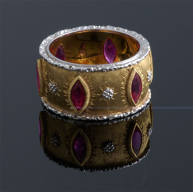 В наши дни, ювелирные мастера этой компании продолжают следовать древним традициям. Кольца, серьги, колье и браслеты этой марки производятся исключительно с применением ручного труда, что делает их еще более ценными и неповторимыми. Кроме того, характерной чертой большинства изделий Buccellati является поверхность с нестандартной филигранной резьбой. Достигается это благодаря тщательному нанесению на металл множества микроскопических насечек, составляющих единое текстурное полотно. Дизайнеры бренда даже выделили несколько основных разновидностей рифленых поверхностей. К ним относятся так называемая Telato – поверхность с эффектом крупнозернистой льняной ткани, Rigato — поверхность, предусматривающая нанесение прямых насечек, и Ornato – поверхность с фигурными, кружевными насечками. Большинство изделий Buccellati делают из белого, желтого, розового, черненого золота и серебра, с использованием бриллиантов, рубинов, сапфиров, жемчуга, топазов. Марка стала особенно популярна в последние десятилетия и магазины Buccellati соседствуют с такими марками, как Cartier, Graff, Harry Winston. Buccelatti это произведения искусства, манящие ценителей своим завораживающим магнетизмом.